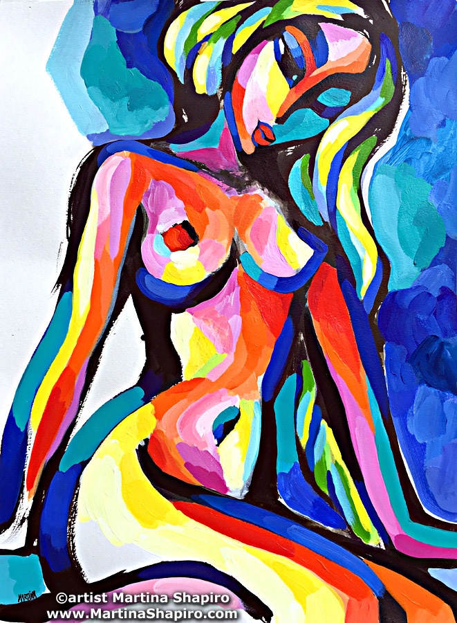 Paper-based abstract nude in blonde and blue tones with expressive line and saturated colour. The source page emphasizes visible paper texture, bright acrylic paint, and the framing flexibility that comes with the work being sold unframed.